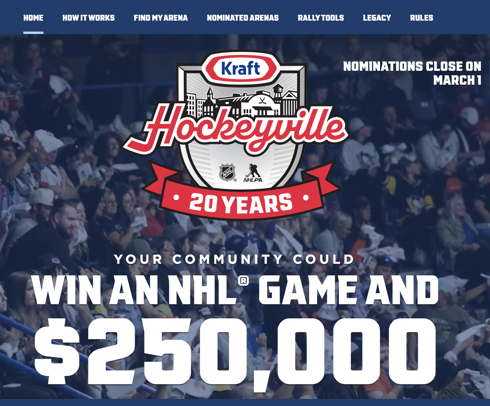 This year is the 20th anniversary Kraft Hockeyville, and they are awarding at least $50,000 to a rink in each province and territory this year. The winners of these prizes will then be eligible for the grand prize of $250k and the opportunity to host an NHL pre-season game.